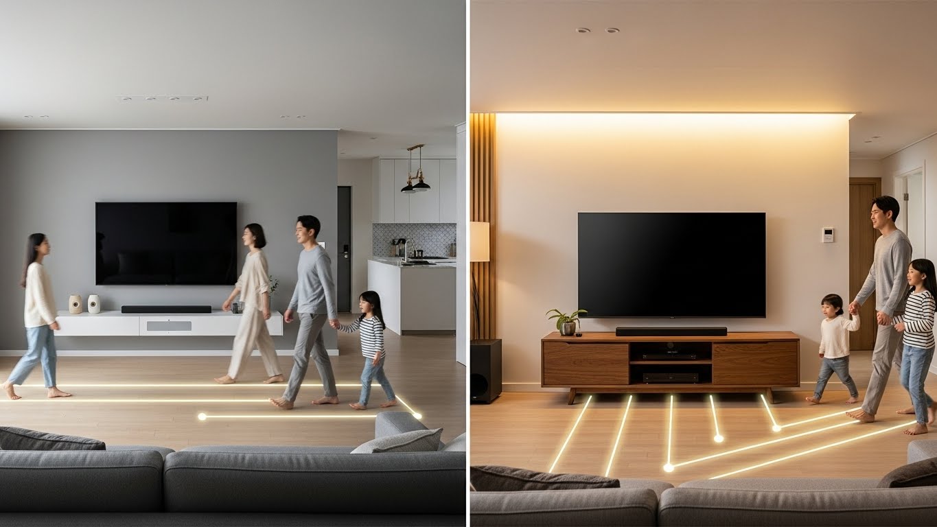 저 역시 라운드형 거실 → 직사각형 거실 → 침실 TV까지 여러 형태를 경험하며 두 방식을 번갈아 사용해봤는데, 공간 구조와 생활 패턴에 따라 만족도가 완전히 달라졌습니다. 아래 내용을 보면 본인 집 구조와 동선에 어떤 방식이 더 잘 맞는지 금방 감이 오실 거예요.