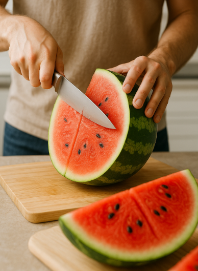 📏 스틱 수박: 반으로 자른 후, 세로로 칼질 → 90도 돌려 가로로 다시 칼질